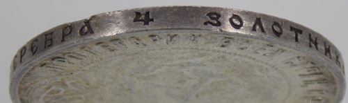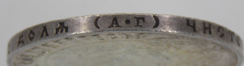 Гурт: Вдавленная надпись «Чистого серебра 4 золотника 21 доля (АГ)»