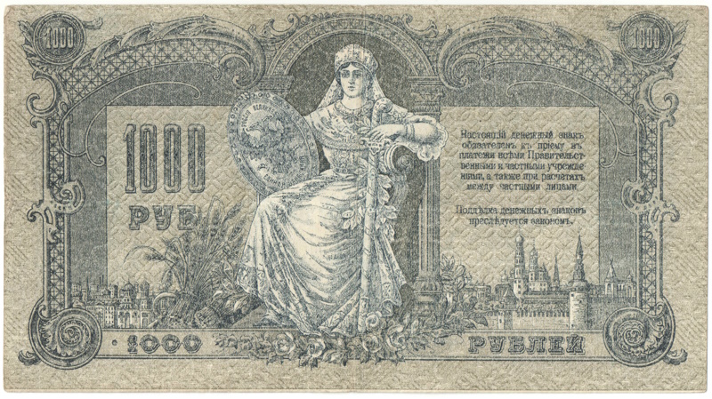 В 1918 году контрреволюционные организации Ростова-на-Дону берут под контроль местную контору Государственного Банка, которая начинает выдавать населению денежные знаки собственного производства, которые должны были стать временными, о чём свидетельствовала надпись «имеет хождение наравне с кредитными билетами». Вначале были выпущены 20, 50 копеек, 1, 3, 5, 10, 25, 100, 250 и 500 рублей, а в 1919 году 50 и 1000 рублей и обновлённая купюра 100 рублей.