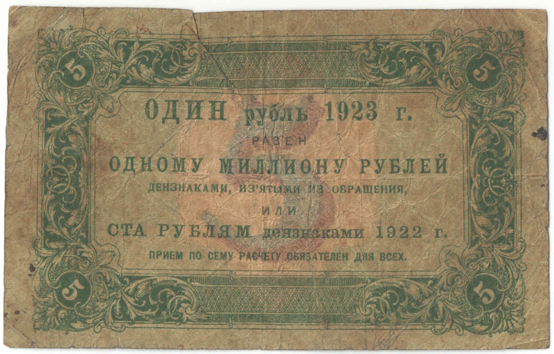 Введены в марте 1923 года в ходе деноминации (новый рубль обменивался на 100 рублей образца 1922), при этом купюры 1922 года продолжали хождение до осени, когда вышли денежные знаки 1923 года нового типа (с изменённой надписью оборотной стороны).