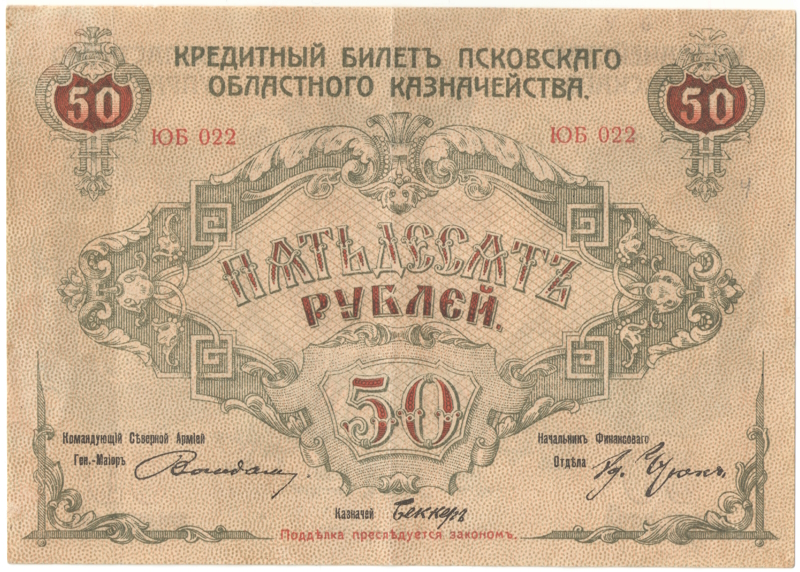 Особенности: Выпущены осенью 1918 года в Пскове белогвардейским движением под командованием А.Е. Вандама, носившего название Отдельный Псковский русский добровольческий корпус. Использовались до середины 1919 года.