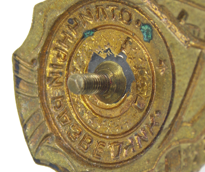 Материал: Сплав цветных металлов (томпак), красная и белая эмаль, штамп, резьба, белое защитное покрытие, пайка.