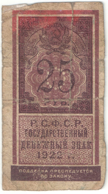 Бона 25 рублей 1922 года (тип гербовой марки) арт 33250